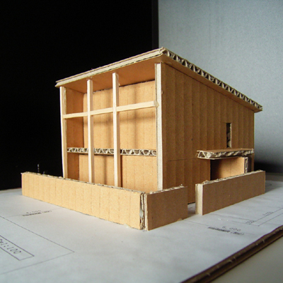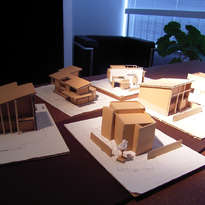 ■ ダンボール模型 ・ 最後に変更の効かないような段階で きれいな模型を作るよりも、 設計の初期段階から大雑把ではありますが、 全体が分かるような模型を ダンボールで作る事を好んでしています。 本来この手の模型は設計者自身が見るだけで 施主には見せないものなんですが、 私は打ち合わせ時に見ていただいたりする場合が 少なくありません。 理由はもちろん一緒に楽しみたいからです^^。 |