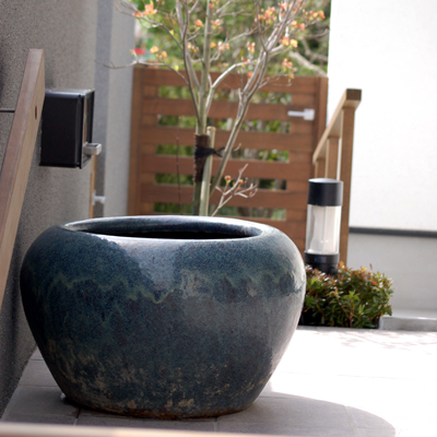 前の家にあった火鉢を、 新しい家の玄関先で金魚鉢に利用されています。 昔のものはいいですね^^。 |