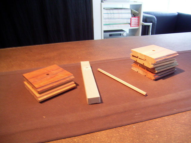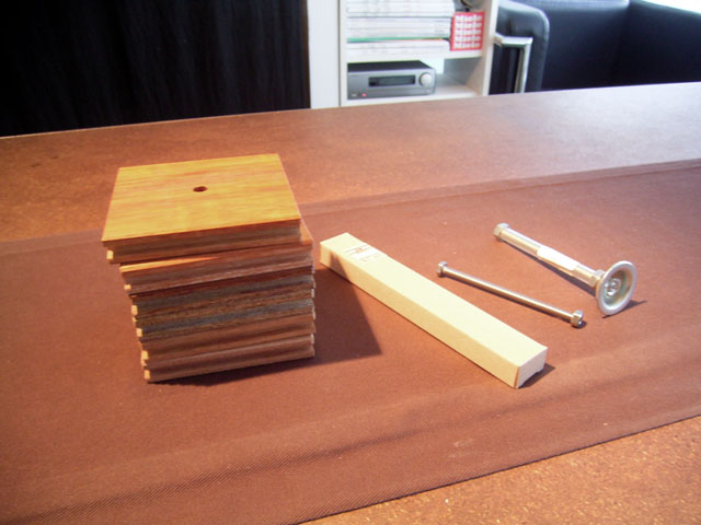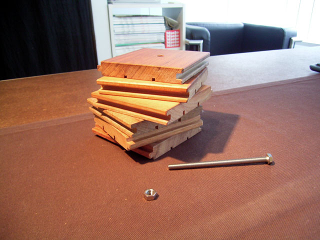 | まずは普通に6角ボルトとナット。長さ100mmなので皿頭や鍋頭のネジはなかなか入手困難です。 (本当は皿頭あたりが薄くていいんですけどね・・・) ![]() 太さはM5にしてみました。で、串刺しにしてナットを締めるとこうなります。 ![]() 立てるとこう。当然ボルトの頭の厚さ分傾きます。 ![]() なんかイマイチ・・・枚数が少ないので45度ずつ回転させてみます。 ![]() 普段コースターとして使う場合はナットはつけないから↑こんな感じでしょうか・・・。 テーブルにも傷が付きそうで怖い・・・。運搬時に使うぐらいでしょうね・・・。 |