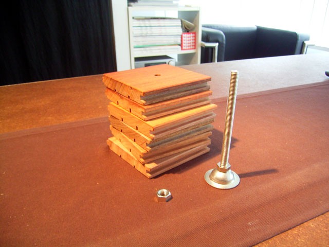 | 次はアジャスターです。これはテーブルなどの家具の足につけて水平を調整する部品です。 丁度高さが100mmでネジ径が8mmの物が売っていたので試して見ました。 ![]() なんか中に浮いている感じで悪くはないですね^^ ![]() ただ、部品の性格上遊びが多いので、若干傾きます。なのでコースターを回転させると・・・ ![]() なんかバラバラな感じですね^^;。ちなみにギリギリナットは締められます↓。 ![]() 穴の大きさとボルトの径が近すぎて、外すときにちょっと引っかかります。まあ使い込めばよくなるかもしれません。 まっすぐ積む場合に限ってはありはありという感じでしょうか・・・^^;。 |