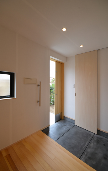 ![]() 玄関は至ってシンプル^^。 向こう側にある引き戸の奥は土間収納です。 墨入りモルタルも目地を切ると高級感があります^^。 |