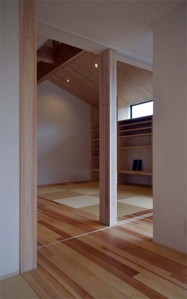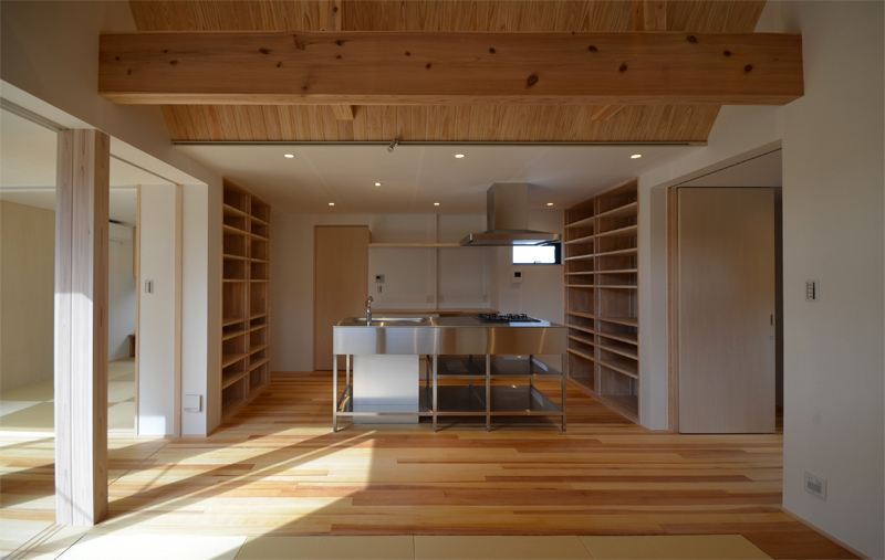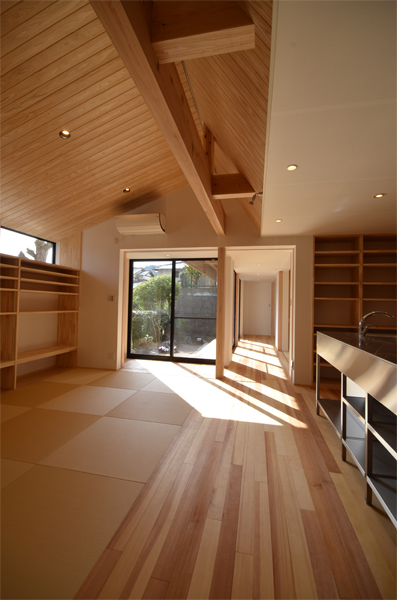 ![]() LDKの天井は杉板張りのアシンメトリーな船底天井です。 頂部が換気スリットになっていて、畳スペースには囲炉裏が設置される予定です。 今回はエアコンはあえての露出取り付けです。見た目的には隠蔽したいところですが 効きとメンテ性が悪くなるのでケースバイケースです^^; |