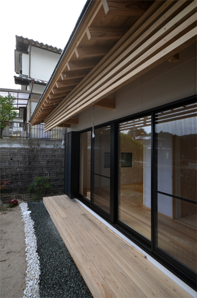 ![]() 濡れ縁は床レベルより一段落として腰かけるのにいい高さになっています。 諸事情あって雨戸が付いています。雨戸付けたの初めてかも^^;。 南側隣地の擁壁は緑で隠れる予定^^。 |