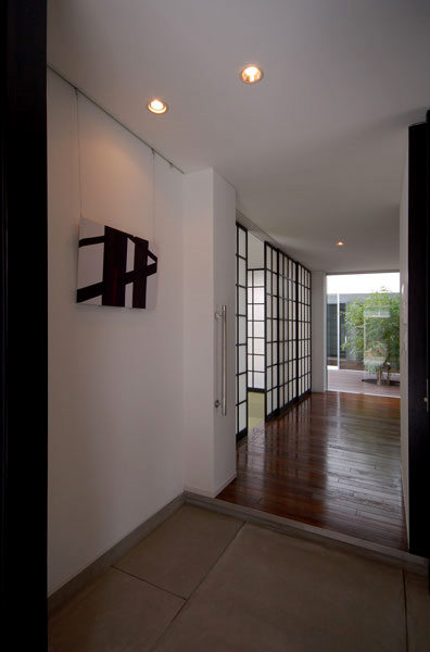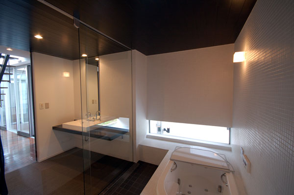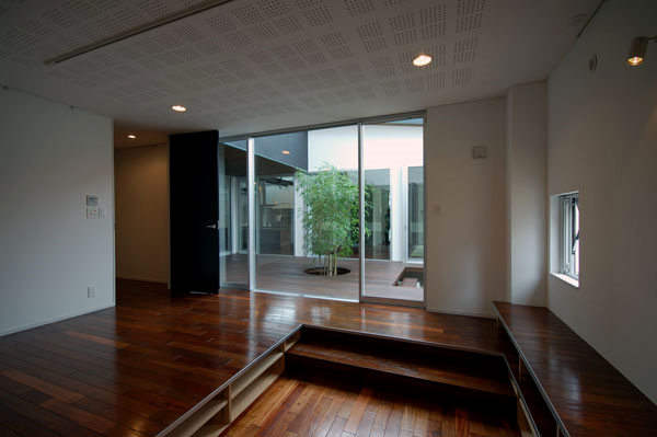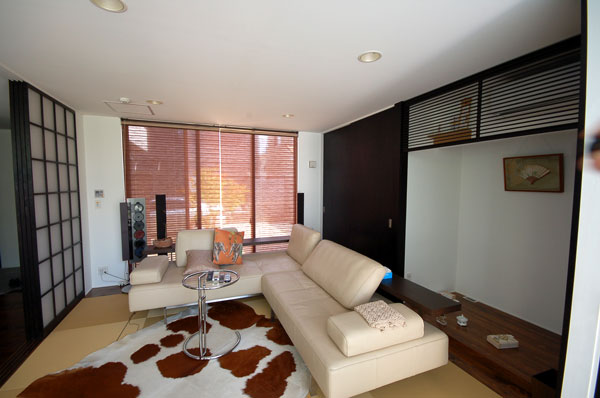 ![]() 中庭を挟んだリビングです。床を一段下げた溜りの場所をサロンと名づけました。 ここに座ると外部のデッキレベルへの視線が低くなるので広がりが感じられます。 防音をしているのでシアタールームにもなります^^。 |