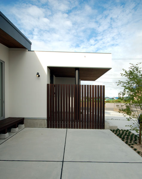 ![]() ガルバリウム鋼板の外壁は施主セレクトの濃緑^^。 アプローチの階段は奥行きを広くとって要介護の車椅子にも対応しています。 |