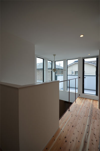 ![]() 2階の床は杉板です。みんなで蜜蝋を塗りました^^。手すりにはネットを張る予定です。 2階の南側はルーフバルコニーなっていて、吹抜への日照が担保されます。また布団も干せます^^。 |