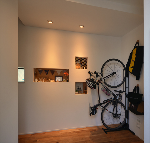 1年検査に行ってきました^^ オープンな壁面収納を使いこなしてますね〜^^ カフェみたいです ![]() 玄関の自転車コーナー^^ ニッチの飾りも充実してました^^ |