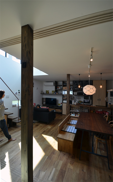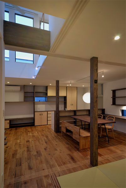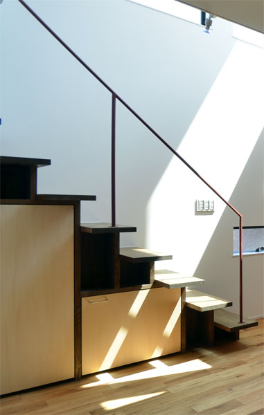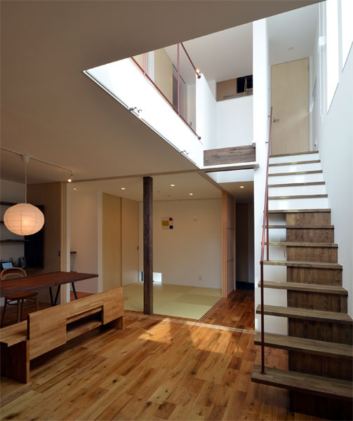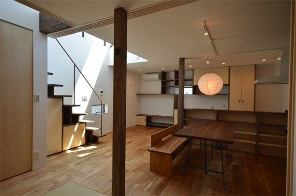 | この住宅は立地の利便性重視で選んだ30坪以下の敷地に、延べ床面積も30坪以下で計画しました。 箱階段というのは日本では古くからある下部を収納に利用した階段形式で、床面積が限られているときの先人たちの知恵です。普段使いでないものなどは小屋裏収納に置いておけばいいですが、よく使うものは壁面収納や箱階段に収納します。 敷地に余裕がなく住宅密集地であることから、1階は通風用の窓だけを設け、南東側採光は階段の吹き抜けを利用して2階レベルからとっています。準防火地域の場合窓の値段が通常の3倍はするという事情もあります^^;。 水まわりは全て1階に設け、LDKと繋がったり閉じたりできる客間は寝室に使うことで、将来は1階で生活を完結することも可能です。 |