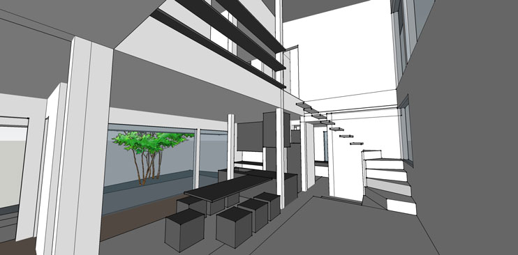 スケッチアップのウォークスルーから1ショット^^。吹き抜けに面した手すり替わりの本棚コーナーをライブラリーと名付ました。