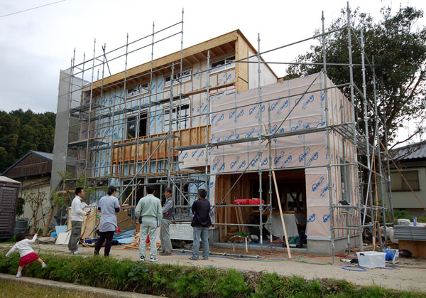 断熱材が2色混合なのは震災の影響によえる建築資材不足から来ています^^;。