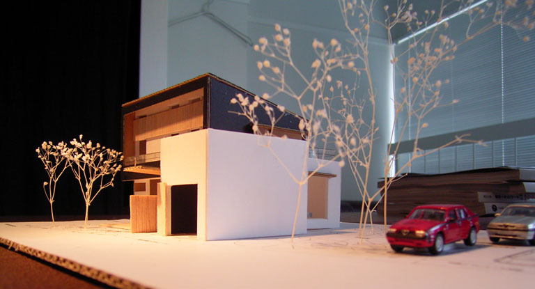 第1案の模型です。敷地が大きいので中央の森を残して片側だけで建物が入りそうです。 |