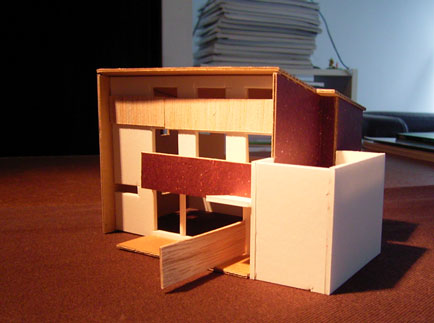 大体おおまかなプランの方向性が定まってきたので、もう一度模型でスタディ。今度は赤で作ってみました^^。 |