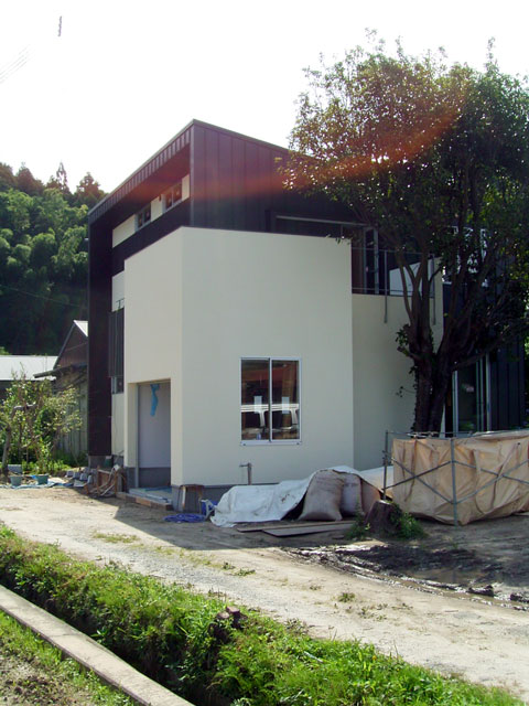 もう足場も外れています。土埃による汚れも考えて外壁はやや黄味を強くしています。 |