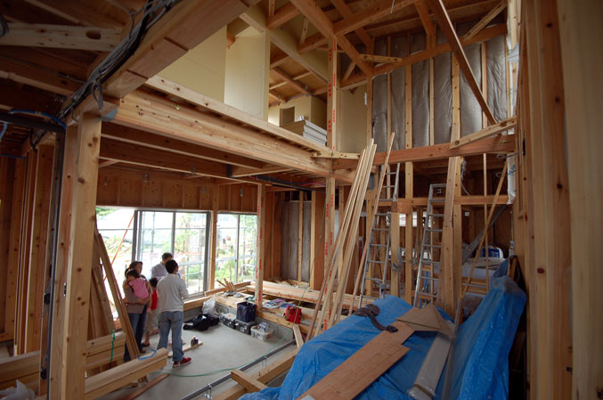 一部内装の下地ボードも貼り始めています。天井高っ^^。小上がりの天井を基準しているので一般部はかなりの天井高さになります。