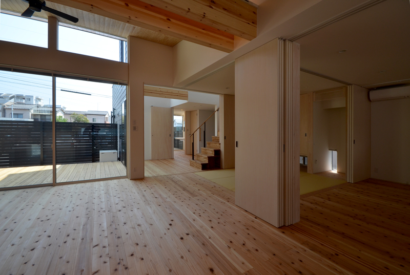![]() 各空間は建具によって分割もされれば融合もします。昔ながらの日本の家屋に近いかもしれません^^ 延べ床面積は2階まで合わせても100uありませんが、建具を開け放てば物凄い広さを感じられます。 床は30mm厚の杉板で下地に合板は貼ってません^^ |