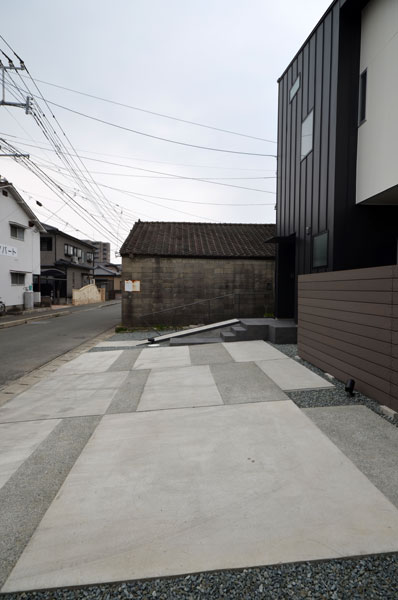 ![]() コンクリート舗装部分は一部洗い出し仕上げで市松模様にしています。 これは駐車位置の目標にもなります^^。 今は照明しかないですが、シンボルツリーが植樹されるのが楽しみです。 |
