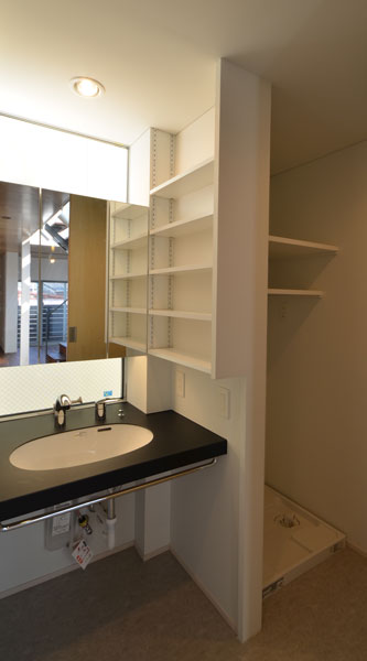 ![]() 洗面カウンターの黒はリビングのシーリングファンと同じくご主人のチョイス。 ナイスだと思います^^。 限られたスペースを最大限使えるように収納は色々とやってます。 鏡の裏の収納は外断熱で空いた壁内スペースも使って大容量。 |