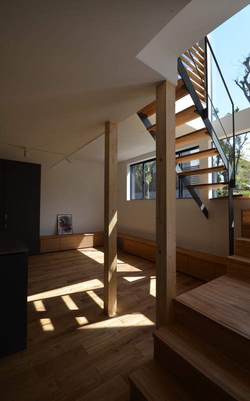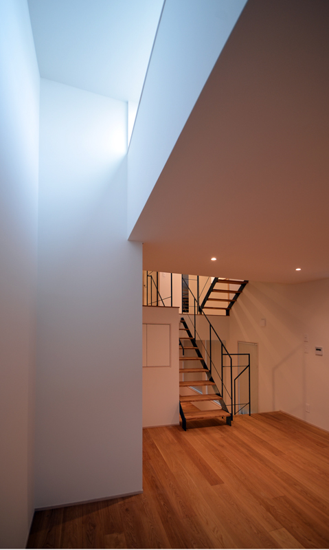 ![]() 1階から半階上がったリビングです。 ハイサイドライトで間接光を採り込んでいます。 |