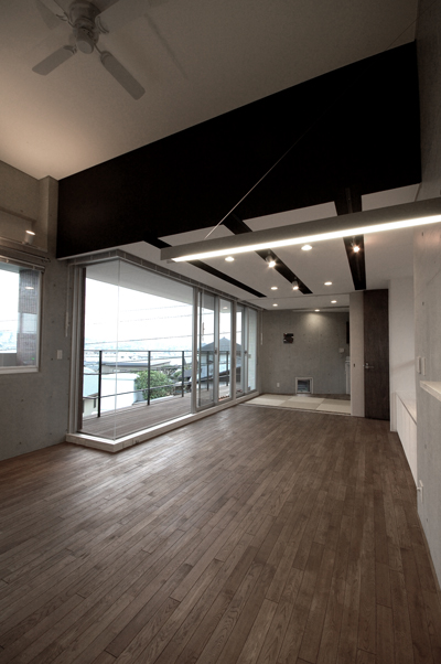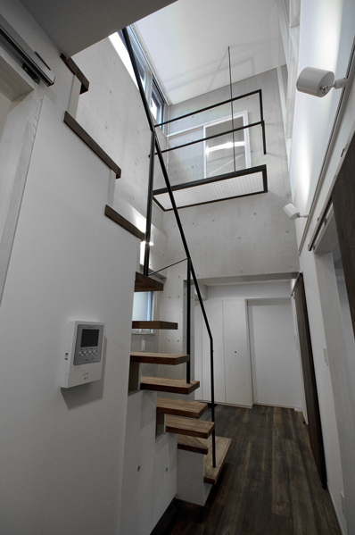 | 景観のいい敷地なのでリビングダイニングは2階に設けています。 吹き抜けを通して1階の気配も感じられるようになっています。 建て主さんのこだわりで、鉄筋コンクリート造ですが外断熱になっています。 |