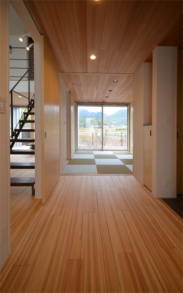 ![]() 玄関を開けた時点で客間を通して北側の景観が開けます。 太陽光は南側から射すので北側の景観が一番美しいというのが日本古来の考え方です。 天井は柾目の杉板を無塗装で貼っています。わがまま言って赤身で揃えてもらいました^^;。 フローリングも柾目の杉(しかも浮造り)ですが縦継材で床暖房対応です。 |