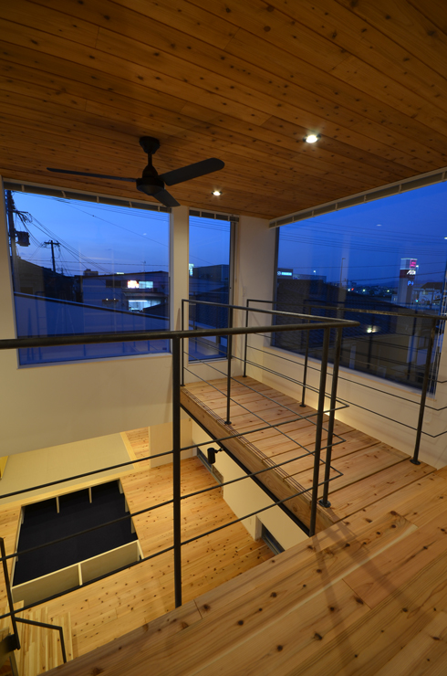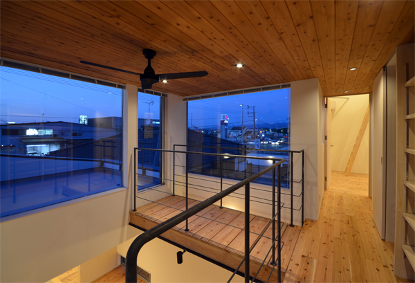 ![]() 吹き抜け上部は光を採りこむガラスの箱のようになっています。 そうしてルーフバルコニーへ行くための橋がかけられています。 天井に節有の杉板は初めて使いましたが、ワイルド好きの方にはいいのではないでしょうか?^^ |
