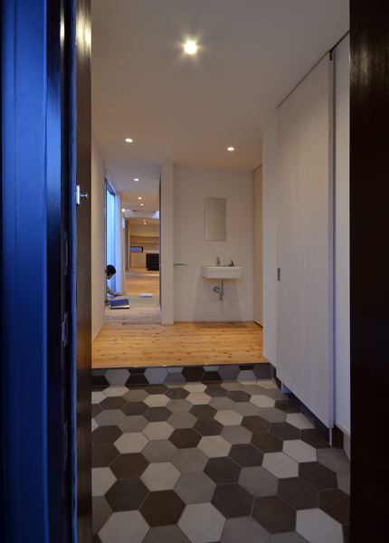 玄関の六角形のタイルは施主セレクトです。 帰ってきてすぐに手洗いとうがいができる洗面台はトイレの手洗い兼用です^^ |