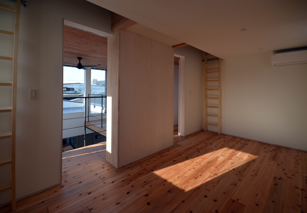![]() 2階の子供部屋は最初は一室で使用して、将来二部屋に区切ります。 ロフトのための梯子も2台用意してます^^。 |