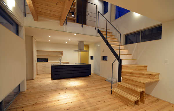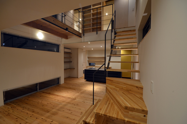 ![]() スケルトン階段を床からのアッパーライトで照らしています。 低い部分の階段の構造材は収納に活用できます。 |