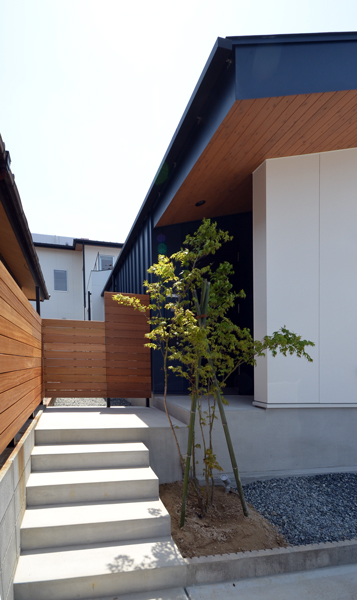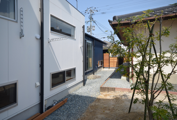 | 当初計画では実家との間にデッキテラスを設けて緩く繋げる予定だったんですが、 予算の関係でそこは将来計画となりました^^;。 |