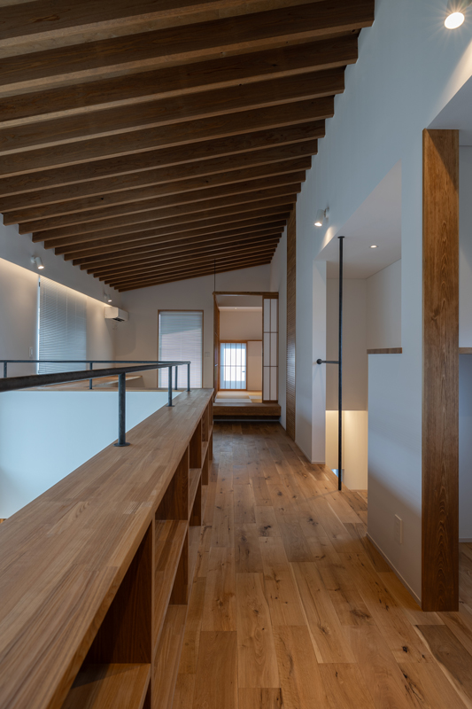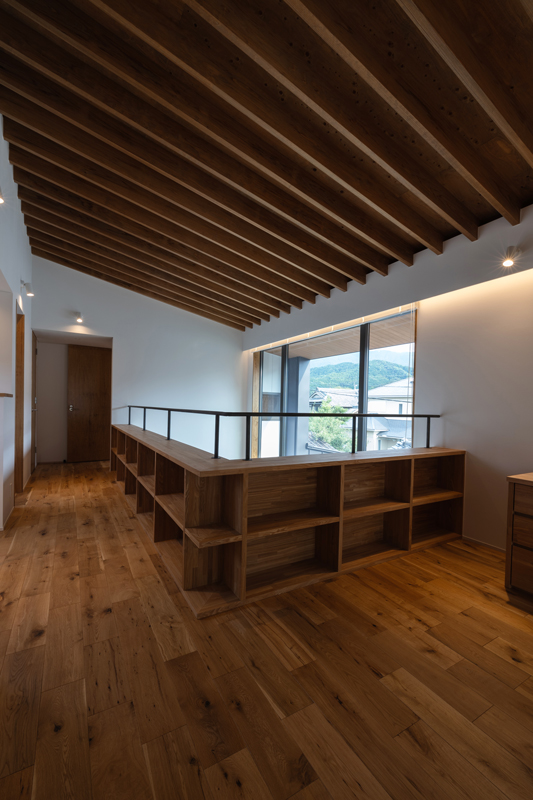 ![]() 一階と二階を繋ぐ吹き抜けを囲んで本棚を設けました。これも施主のリクエストです。 |