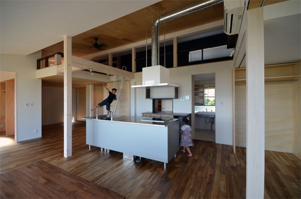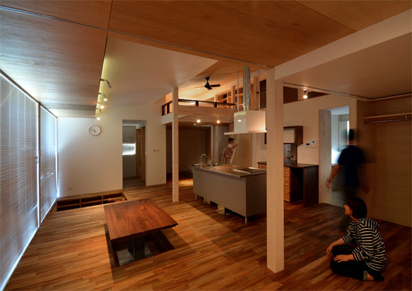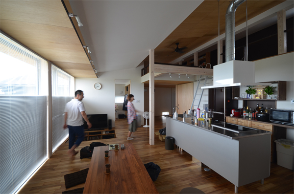 | 諸事情あって法的には2階建てですが、実質は平屋建ての住宅です。 限られた予算と面積(ロフトを除くと26坪)を最大限に生かす為に、可変性を持つプランになっています。 主寝室以外はワンルームとして使えます。客間は仕切れば玄関から直接出入りできる閉じた空間にもなります。 将来的には子供部屋も簡単に間仕切る事ができるようになっています。平屋だからこそ可能なプランともいえます。 なので26坪の家なのにLDKが現状36畳あったりするわけです^^。 更に上部のロフト空間もオープンなので物凄く広々としています。 そうしてこの大部屋には床に大きな穴が二つ開いています。 一つはリビングとしての役目を持つもので、もう一つは掘りごたつ式のダイニングになっています。 |