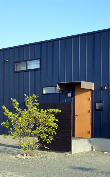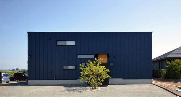 ![]() 外観は極めてシンプルに矩形です。 青色はご主人の好きな色です。 奥様の好きなこげ茶色は室内で多用しています^^。 車5台は楽勝で停められます。 |