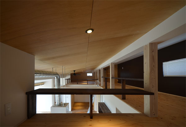![]() この家の大きな特徴は広大なロフトです。 1階の空間と仕切らないことで空間を広く感じさせる役目もあります。 1階床下とロフト最上部はダクトで繋いで夏と冬で逆方向に空気を循環させます。 |