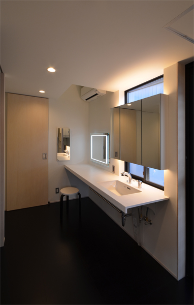 洗面は鏡がいっぱい^^;。 ハリウッドライト内臓の鏡は化粧時専用。 側面の鏡はメディスンボックスです。 |