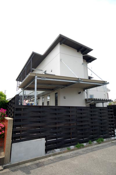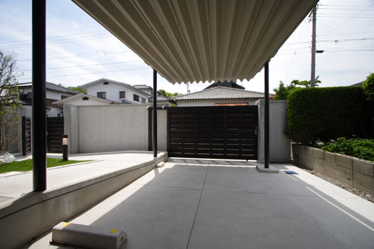 裏手のガレージは吊構造で柱を無くし駐車し易くしています。