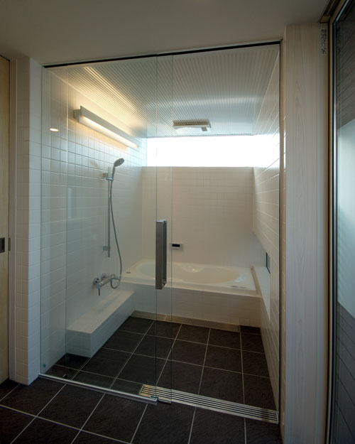 浴室壁はオーソドックスに100角タイル貼です^^。大きさも色も床タイルとのコントラストが効いてます。 |
