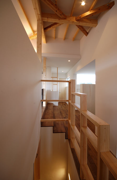 床下へ続く開口部の落下防止手すりは階段状になっていて猫が遊ぶ予定。
