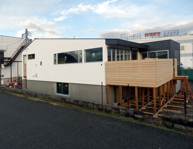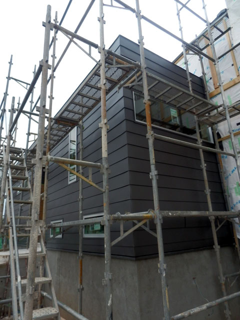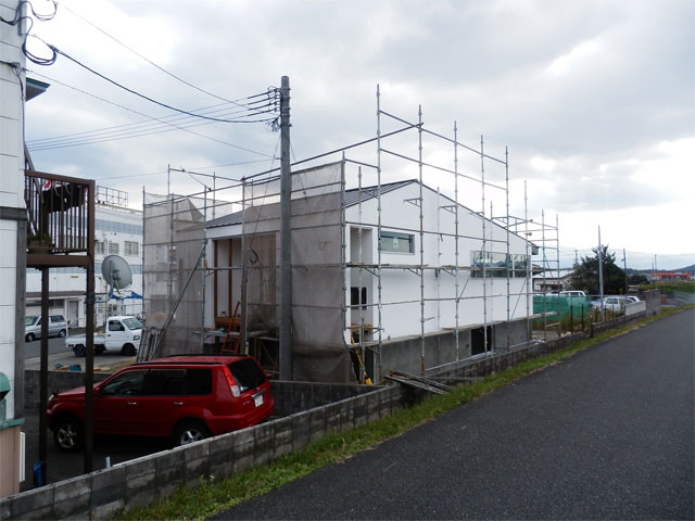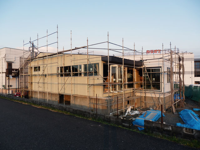 外壁の下地ボードが貼られました。ちなみにカラオケ屋の看板は後ろの建物です^^;。 |
