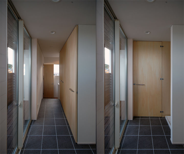 洗濯機置き場の目隠しの扉を開くと・・・脱衣室になります^^。床は磁器質の300角タイル貼。 |