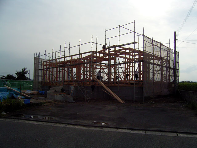 棟上げです。川沿いの敷地なので高基礎にしています^^。 |
