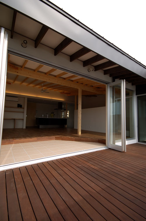 リビングに続くデッキテラスには土手からの目隠しを考えて、やや高めに木塀が設けられています。 |