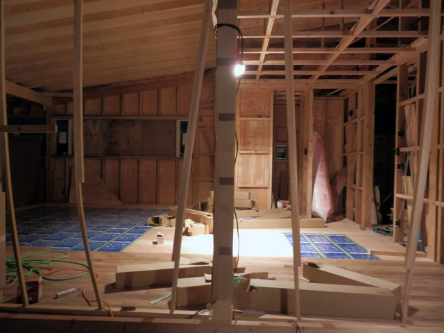 床を貼り始めています。青く見えるのが薄型の床暖房シートです。