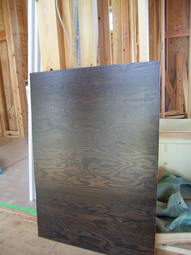 現場で今回の見せ場ラーチ合板の塗装見本を作ってくれました。