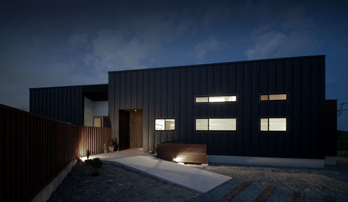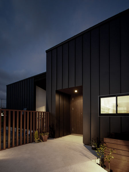 ![]() 正面外壁はガルバリウム鋼板縦はぜ葺きです。外部使用木材はウリン。 |
