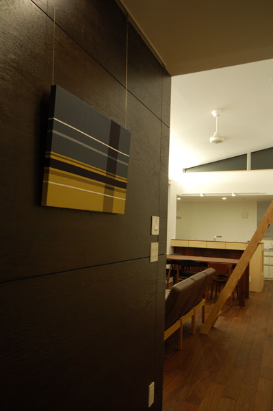 ![]() 今回計画をイメージしたオリジナルのパネル。私からの竣工のお祝いです^^。 壁はラーチ合板にウレタン染色塗装です。 |