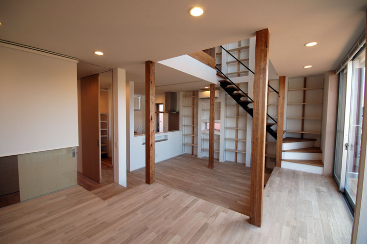 床の塗装は施主工事です。外断熱でできた壁内の空間を利用して階段横は壁一面の本棚です^^。 |