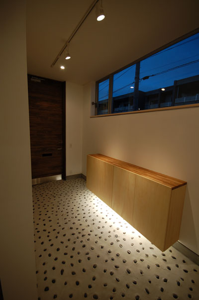 もうじき竣工です。施主要望で玄関踏み込みのモルタルには石が埋めてあります。かわいい感じですね^^。 |