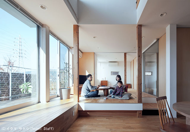 ![]() 夏場は南向きのサッシにブラインドをかけても、軒の深い2階窓から光を取り込めます。 床の段差は丁度腰掛けるのにいい高さにしています。 |