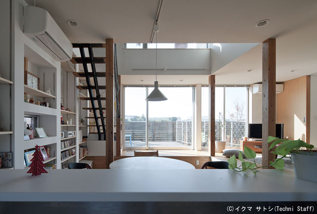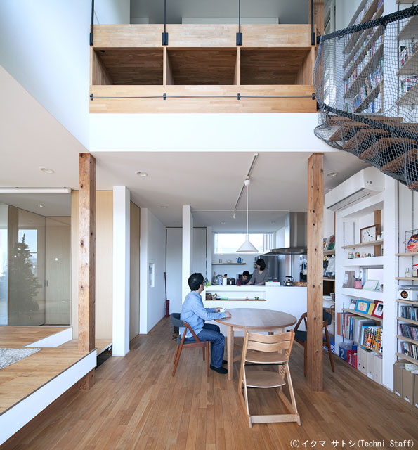 | 川沿いに建つこの家は万が一の氾濫対策も考えて基礎の高さが1m以上ある高床式です。 そうしてできた1階の床下は大規模な収納スペースになっています。 更に1階の床高さは2レベルに分かれていて、これに2階とロフトを合わせると合計5つの床レベルがあります。 この5層を縦に繋ぐ吹抜を通して川沿いの景色を家全体で借景しています。 |
