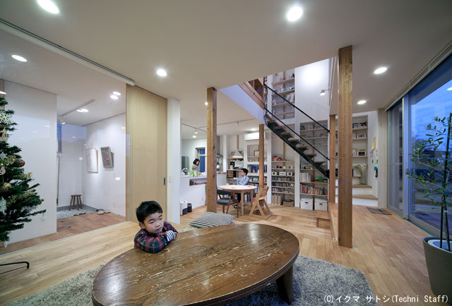 ![]() リビングから直接玄関に出ることも出来ます。ガラスで仕切って広さを感じさせながら光熱費を節約。 どこから入ってもみんんがいるところを通らないと階段には辿り着けない動線計画です。 |